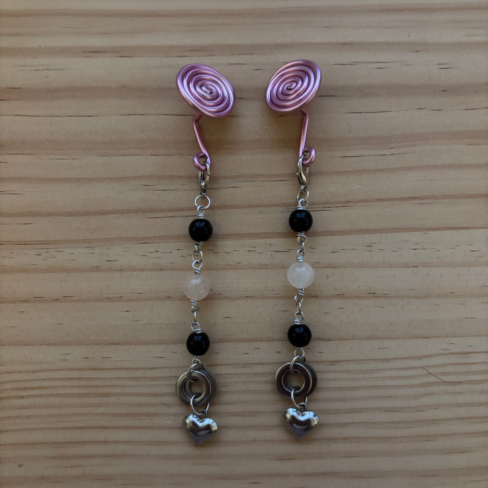 Made of: light pink colored aluminum spiral stopper, silver colored claw clasps, black glass beads, rose quartz beads stainless steel washers, silver colored heart charm