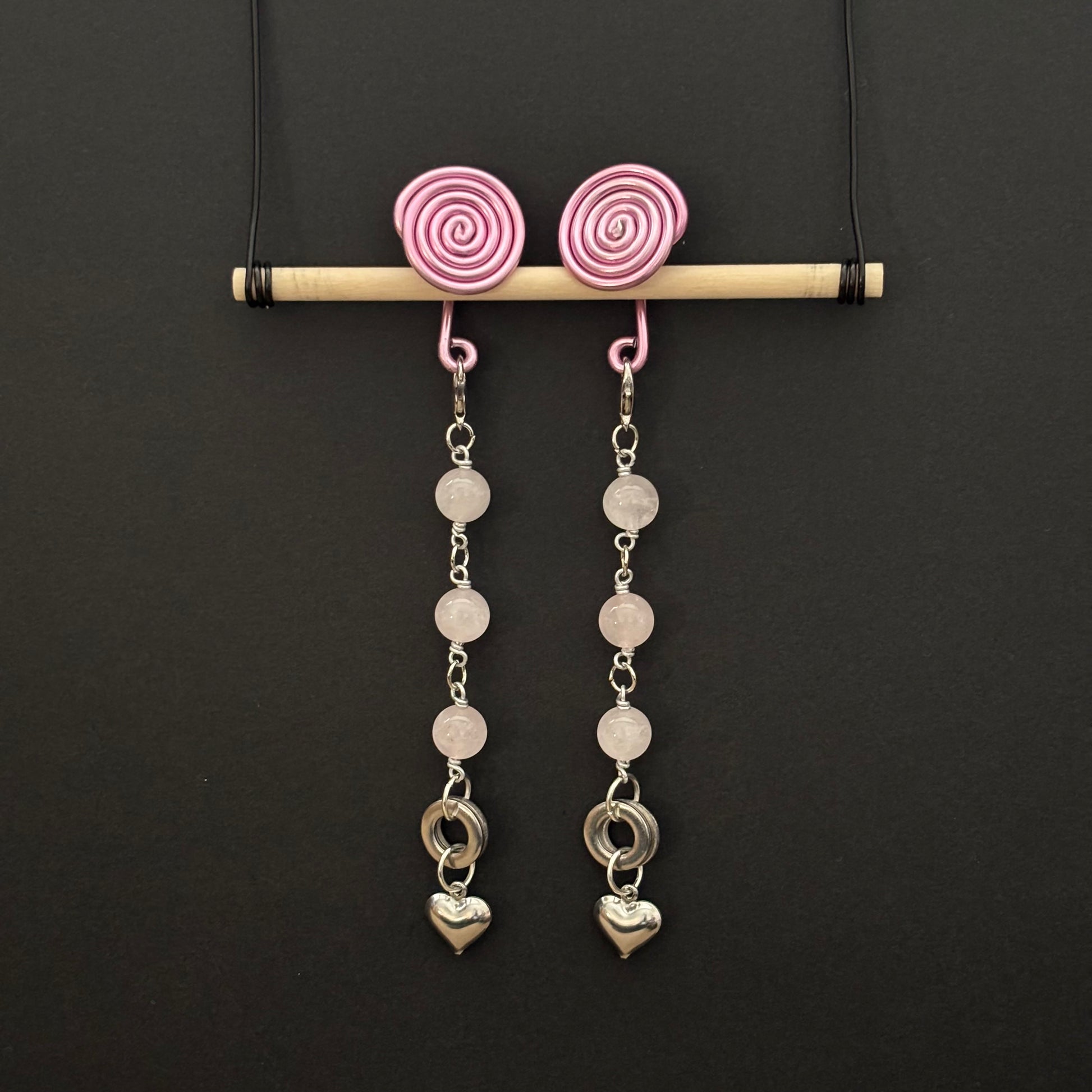 Pink Spiral Gauge Earrings | Rose Quartz Heart