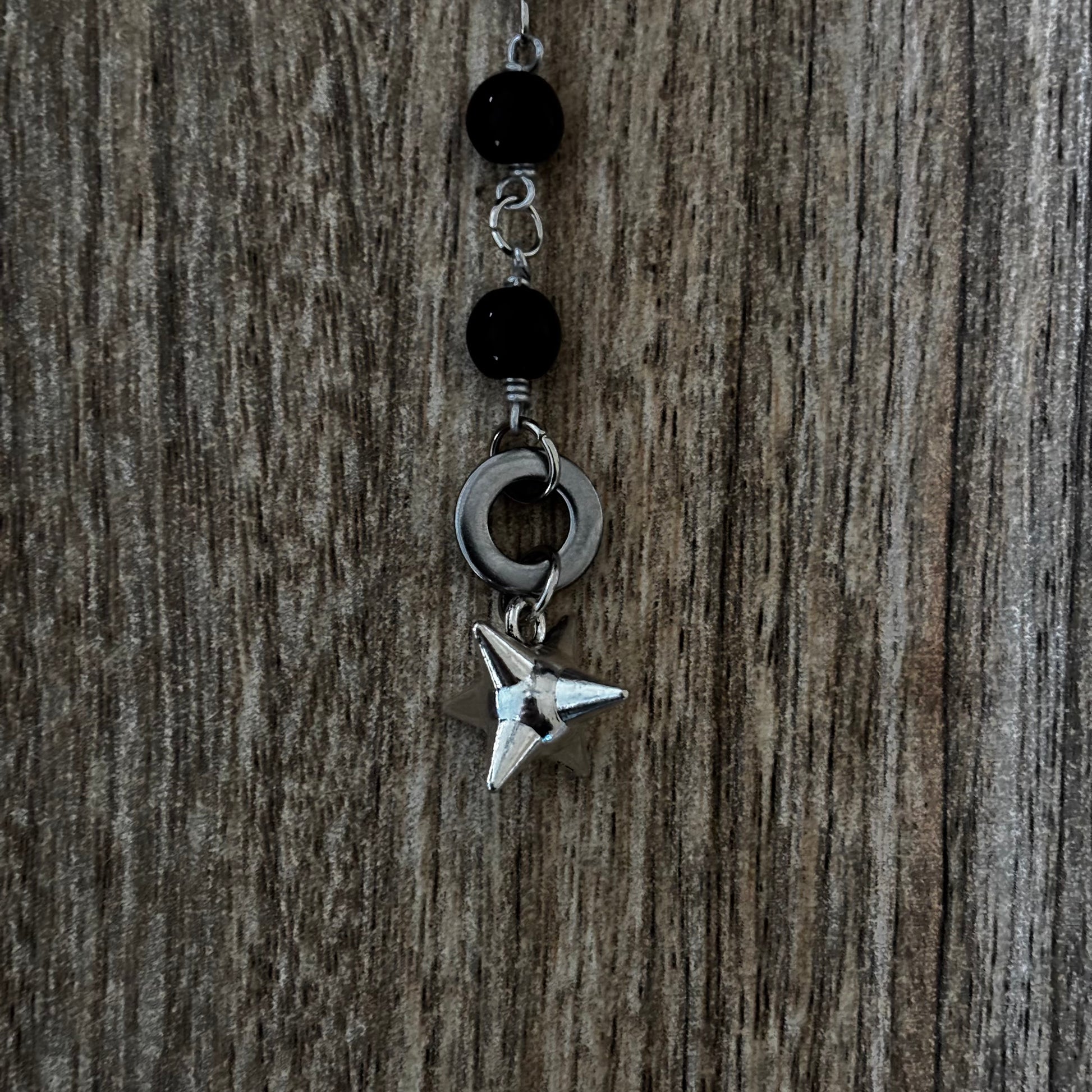 Made of: silver colored spiral stopper, silver colored claw clasps, black glass beads, stainless steel washers, Spike ball charms